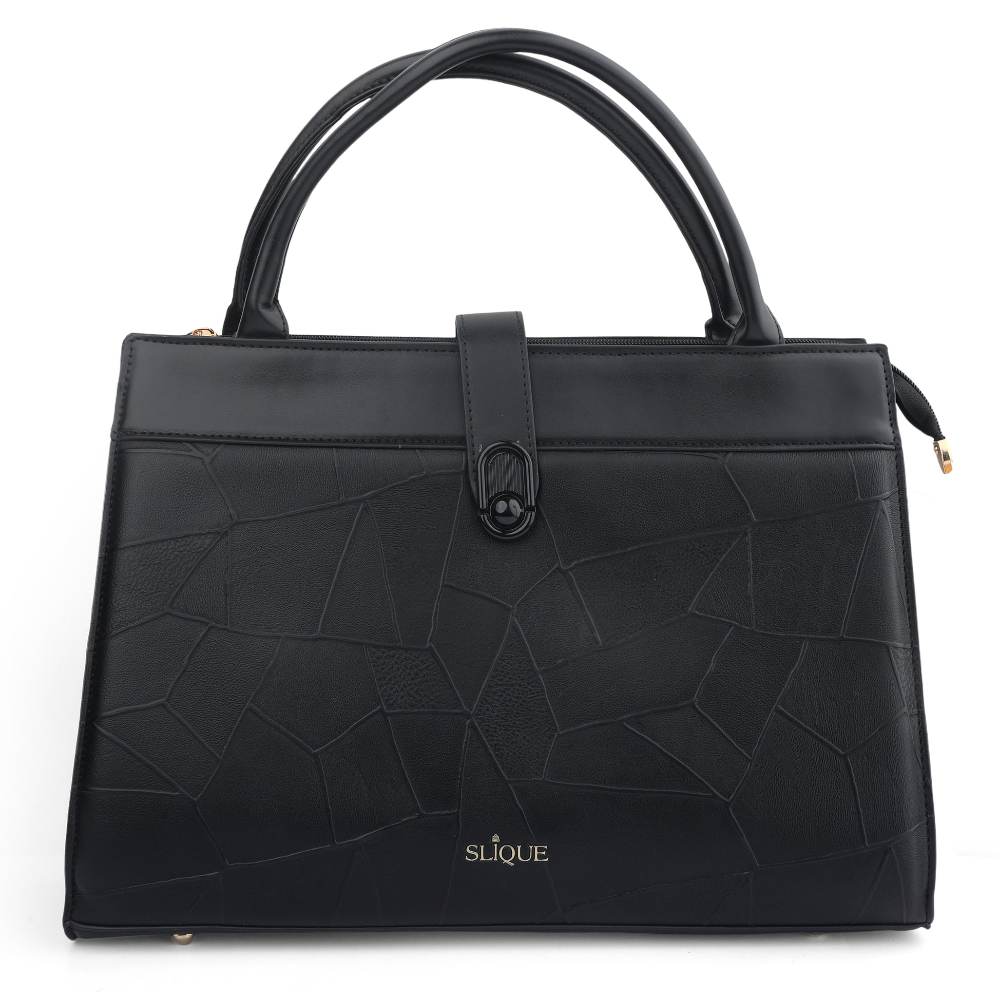 The standout feature is its stunning geometric mosaic texture, which adds a layer of subtle yet captivating detail to the classic black faux leather. Its sharp, structured silhouette ensures it stands upright, keeping your belongings organized and accessible. Finished with sophisticated dark-tone hardware and the elegant SLIQUE branding, this handbag is the epitome of corporate chic.