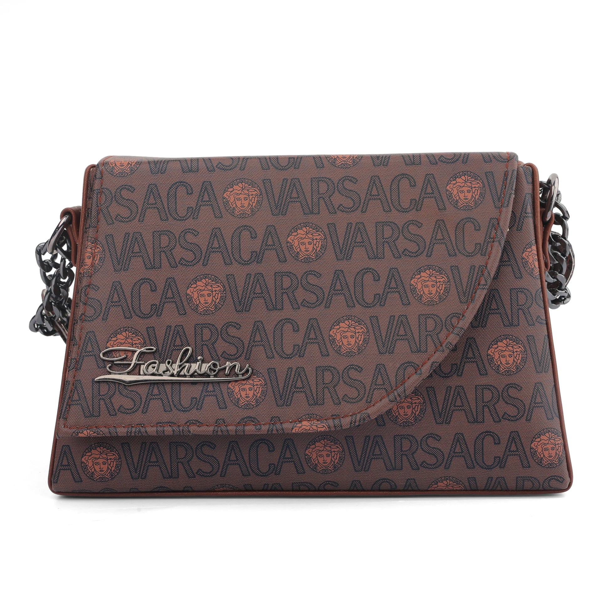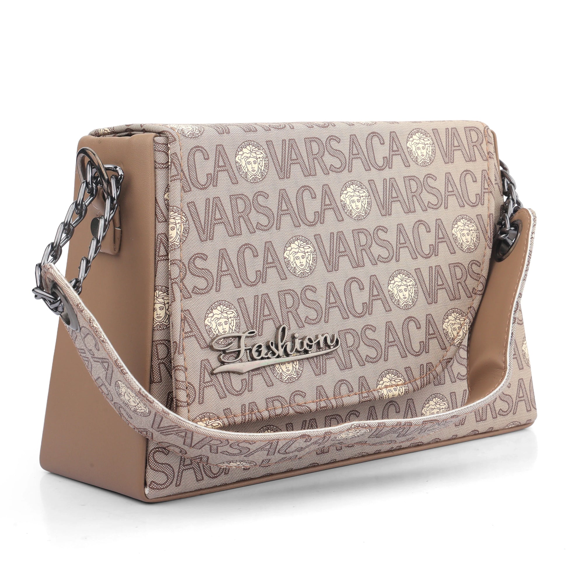 The bag is adorned with a prominent "Fashion" logo in elegant script and features a versatile strap with a chunky chain detail, blending classic luxury with modern edge. The wide, comfortable strap is also printed with the signature pattern, ensuring you look stylish from every angle. Available in two classic colours—rich brown and sophisticated beige—this bag is the perfect accessory to elevate your look.