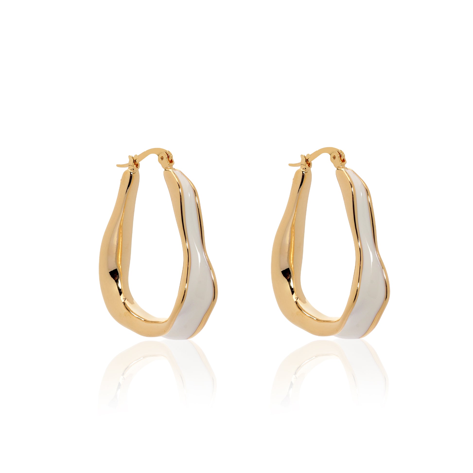 These gold-plated twisted hoop earrings bring a fresh, contemporary vibe to a timeless classic. Designed with a unique curved silhouette, the hoops are accented with smooth white enamel, creating a striking two-tone effect.