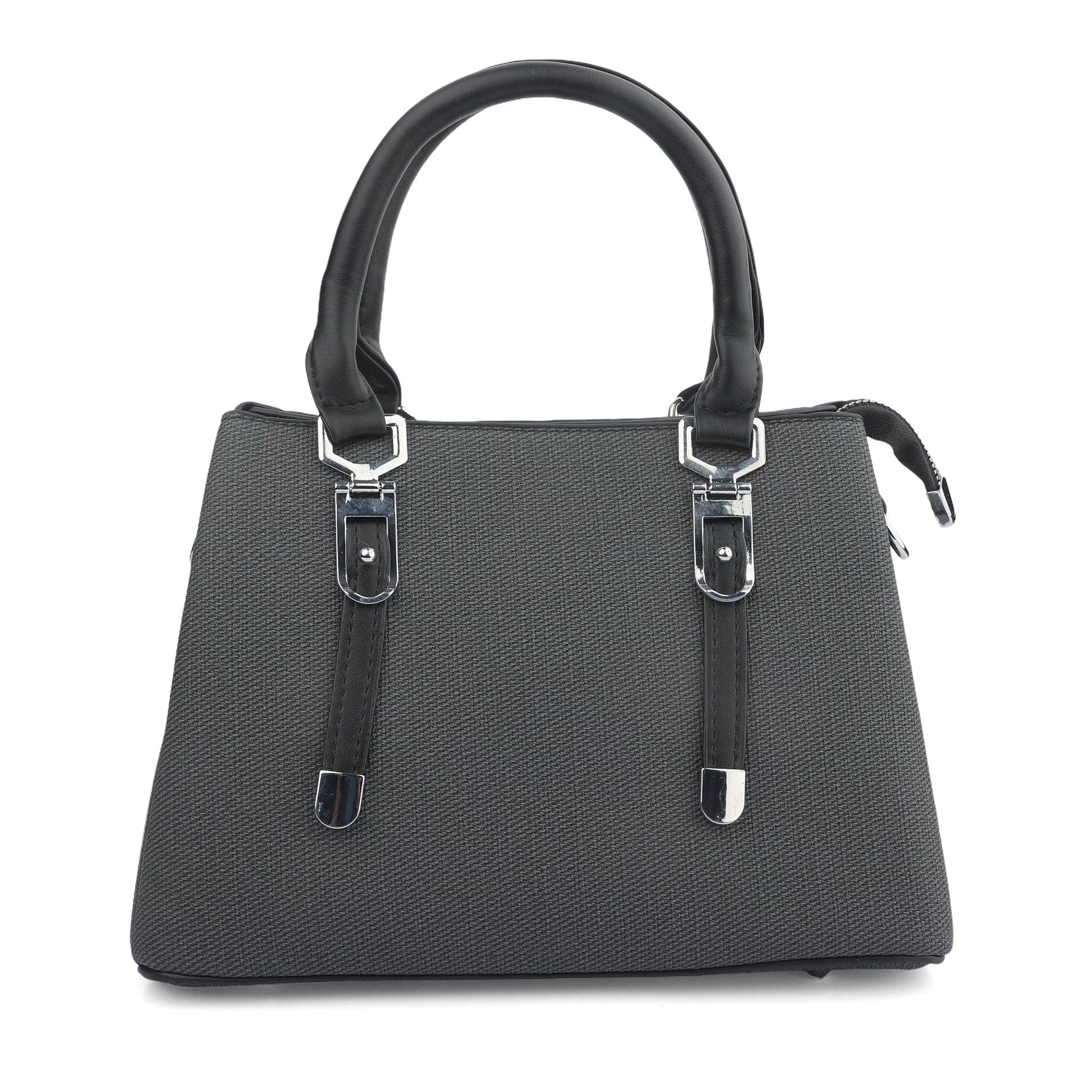 This beautiful bag features a sophisticated combination of durable, textured charcoal grey fabric and smooth, classic black faux leather. The gleaming, polished silver-tone hardware adds a contemporary touch of luxury. For ultimate versatility, carry it by its chic rolled top handles, or attach the adjustable long strap to wear it as a comfortable shoulder or crossbody bag, keeping you hands-free on your busiest days.